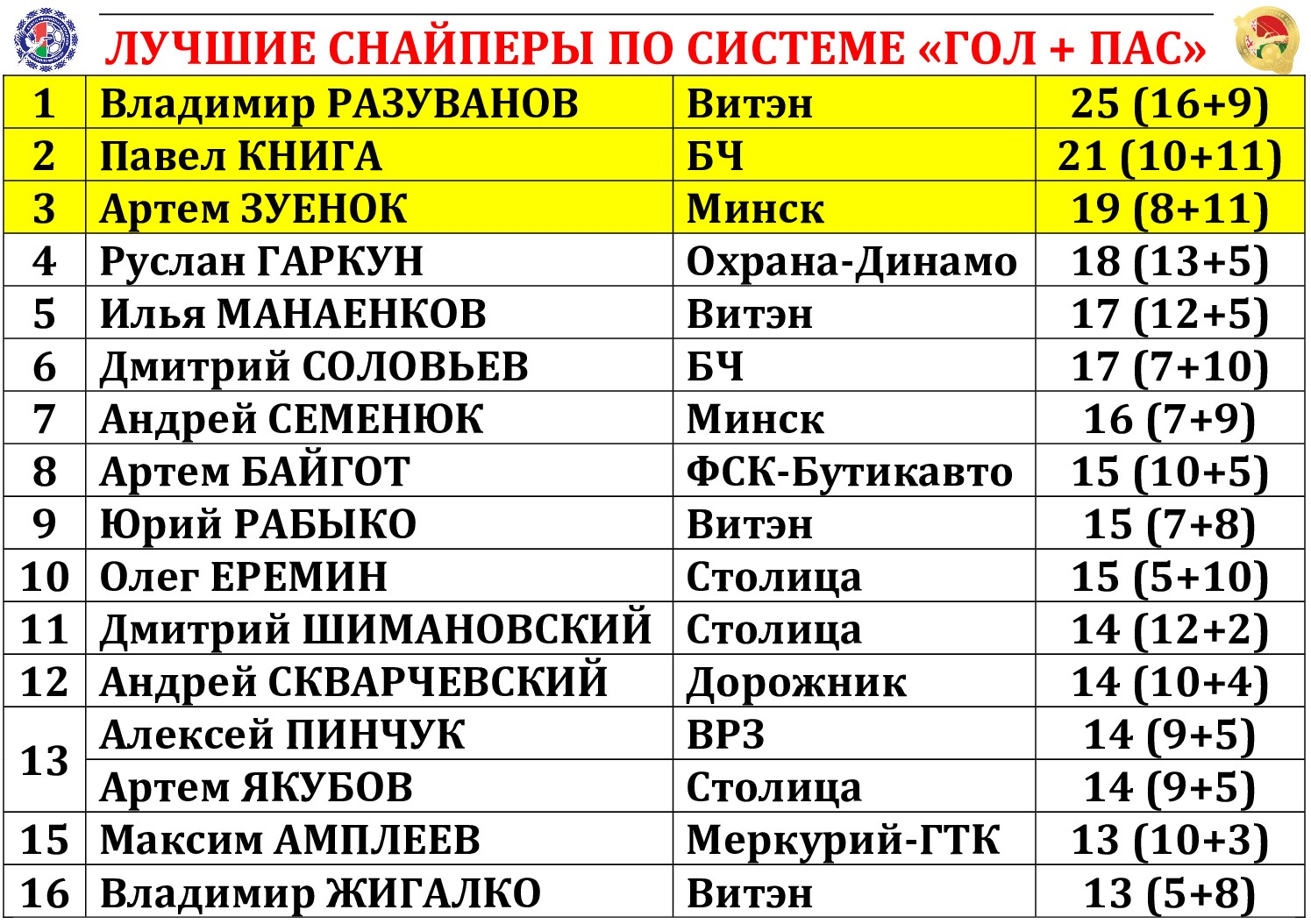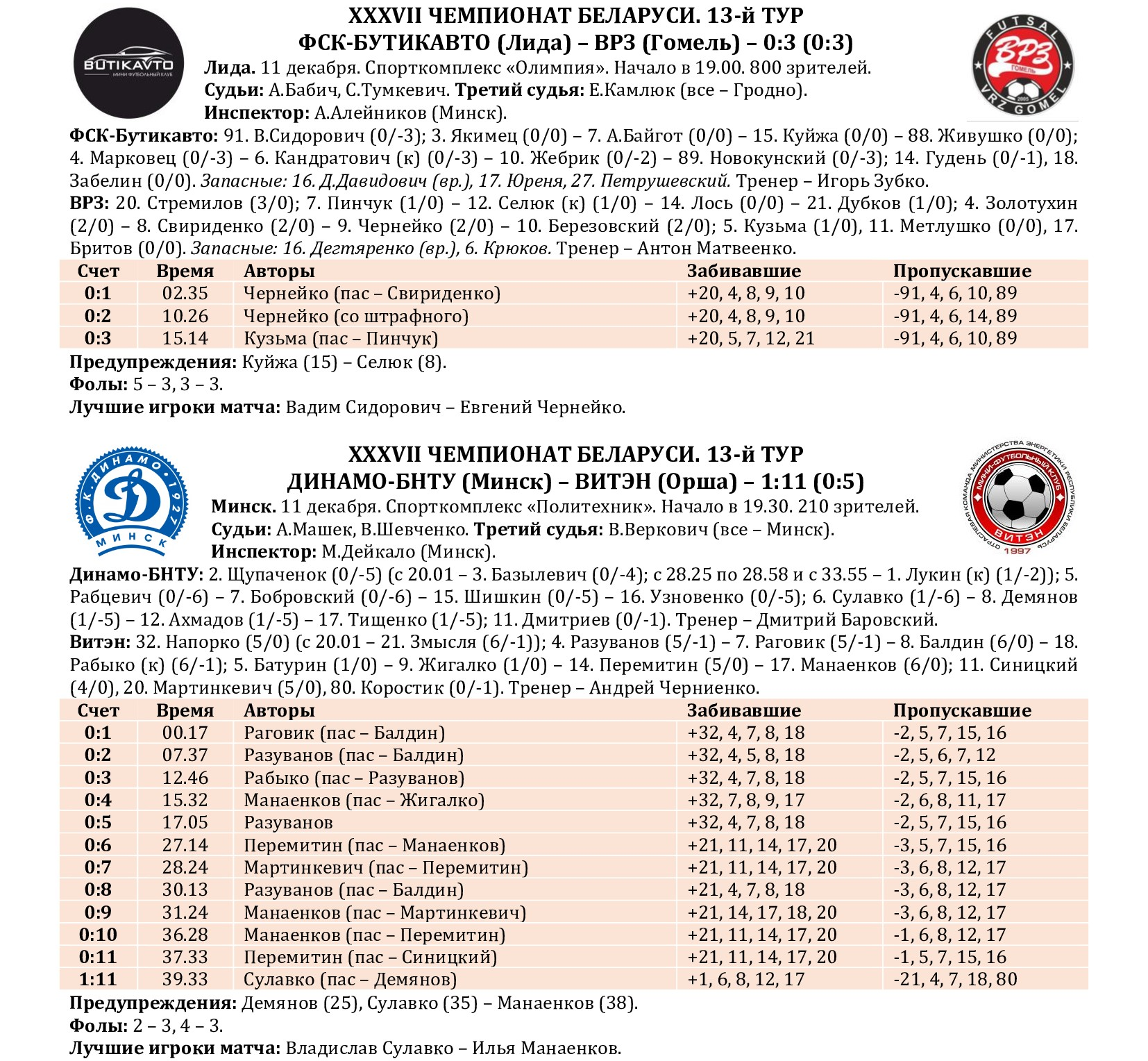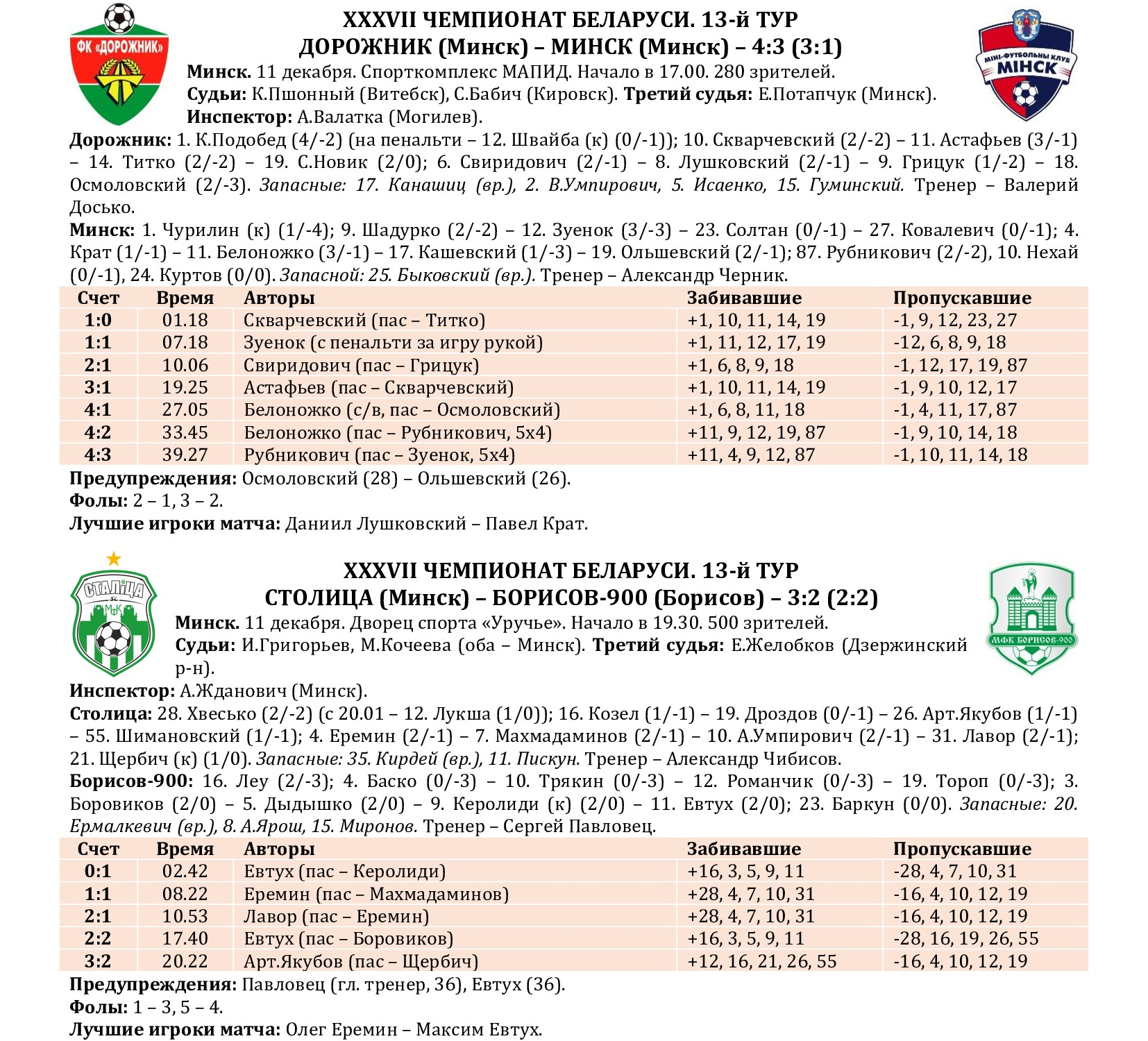 По традиции на сайте МФК «Столица» мы подводим итоги прошедшего тура с полной статистикой всех матчей, где указаны не только ассистенты при голевых «выстрелах», но и показатели по системе «плюс/минус» (статистический показатель полезности игрока, который отражает разность забитых и пропущенных командой мячей в то время, когда тот или иной игрок находился на площадке). Турнирная таблица, списки лучших бомбардиров, снайперов и самых полезных, символическая сборная, лучший игрок тура, ссылки на видеотрансляции и видеообзоры, 10-ка самых красивых голов, выпуски телепрограмм «Ясно о мини-футболе» и «Пятый полевой», репортаж об итогах из газеты «Прессбол» – вся информация о минувшем туре под одним заголовком!