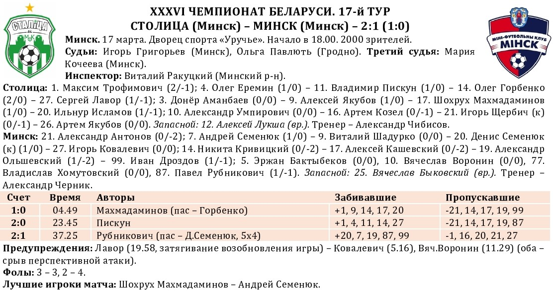 Пропустив тур 16-й (он перенесен на 26 марта) и вернувшись из Венгрии, «столичники» и «горожане» сошлись в минском дерби, чтобы выяснить, кто же в столице сильнее. Принципиальность матчу подогревали несколько факторов. Во-первых, «Столица» проводила юбилейный, 400-й матч в высшей лиге, во-вторых, при двух последних свиданиях неизменно побеждал «Минск», в-третьих, на домашней арене в «Уручье» хозяева сопернику никогда не проигрывали (6 побед и 1 ничья), в-четвертых, для поднятия зрительской активности был организован батл клубных академий… И несмотря на всего три забитых мяча, игра удалась. Держала многочисленных болельщиков в тонусе с первой и до последней минуты. До матча «Столица» чествовала свою женскую команду, четвертый год кряду ставшую чемпионом страны, и символический первый удар, ставший своеобразным напутствием ребятам, сделала ее капитан Ольга Анисковцева.