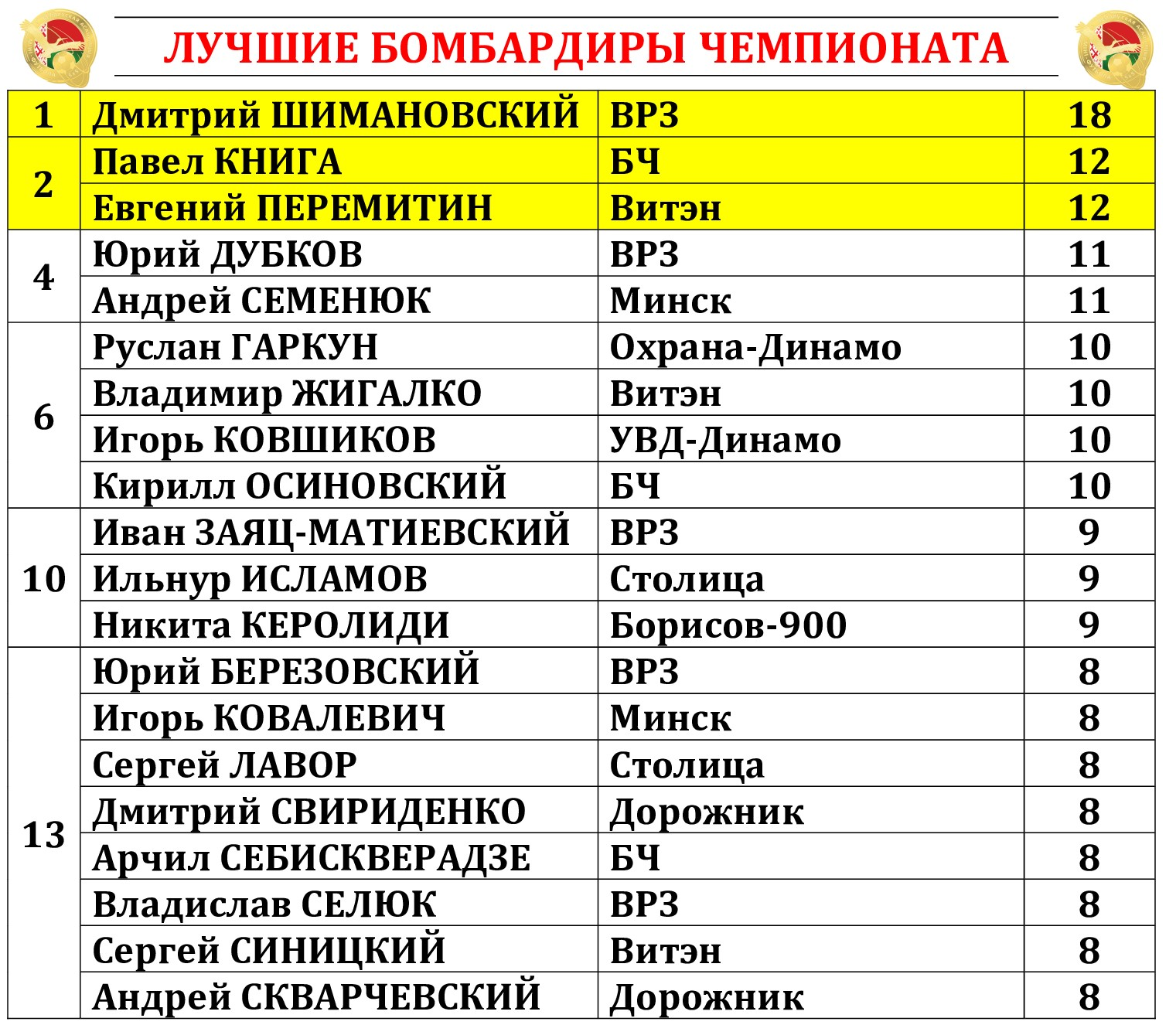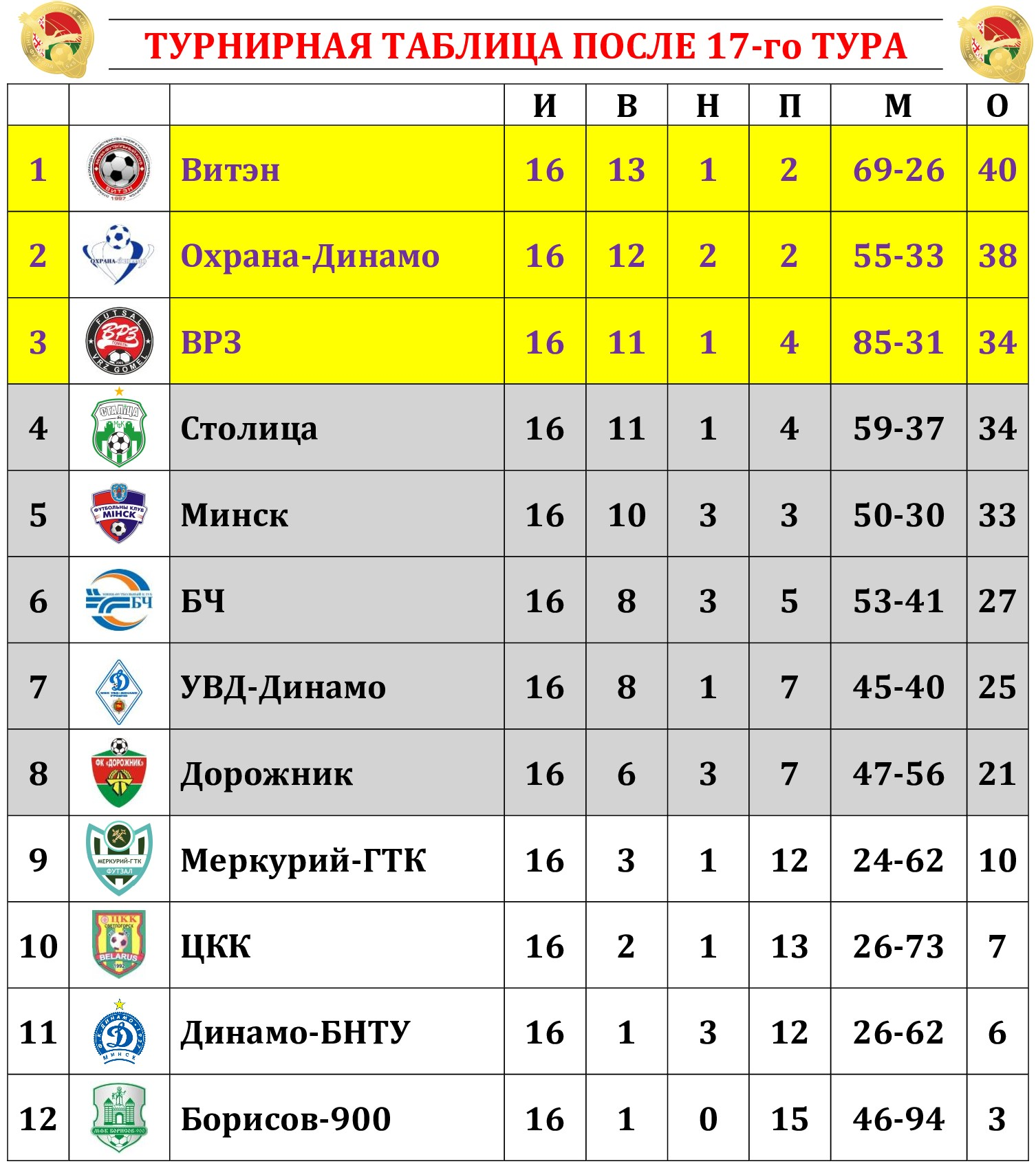 Результаты остальных матчей 17-го тура: 15.03. Охрана-Динамо – ЦКК – 5:4 (3:2) (Афанаськов, 9, 14, Гаркун, 11, 39, Алешкевич, 27-с/в; Кичкин, 14, 17, Белый, 26, Згурский, 29). УВД-Динамо – Динамо-БНТУ – 3:0 (1:0) (Носаль, 5, 22, Ковшиков, 32). Борисов-900 – Дорожник – 7:10 (2:4) (Баркун, 5, 26, 38, Евтух, 7, Боровиков, 24, Керолиди, 29, 35; Гуминский, 2, Арешков, 3, 20, 31, 32, Скварчевский, 20, 30, Свириденко, 28, Сенчило, 34-с/в, Дунаев, 40). 16.03. Витэн – ВРЗ – 4:2 (4:1) (Лазюк, 6, Перемитин, 10, Разуванов, 12, Рабыко, 16; Лось, 8, Мартинкевич, 27). БЧ – Меркурий-ГТК – 6:2 (2:1) (Книга, 6, 30, 39, Евдокимов, 15, Себискверадзе, 26, Осиновский, 32; Мусиенко, 7, Чибисов, 38).