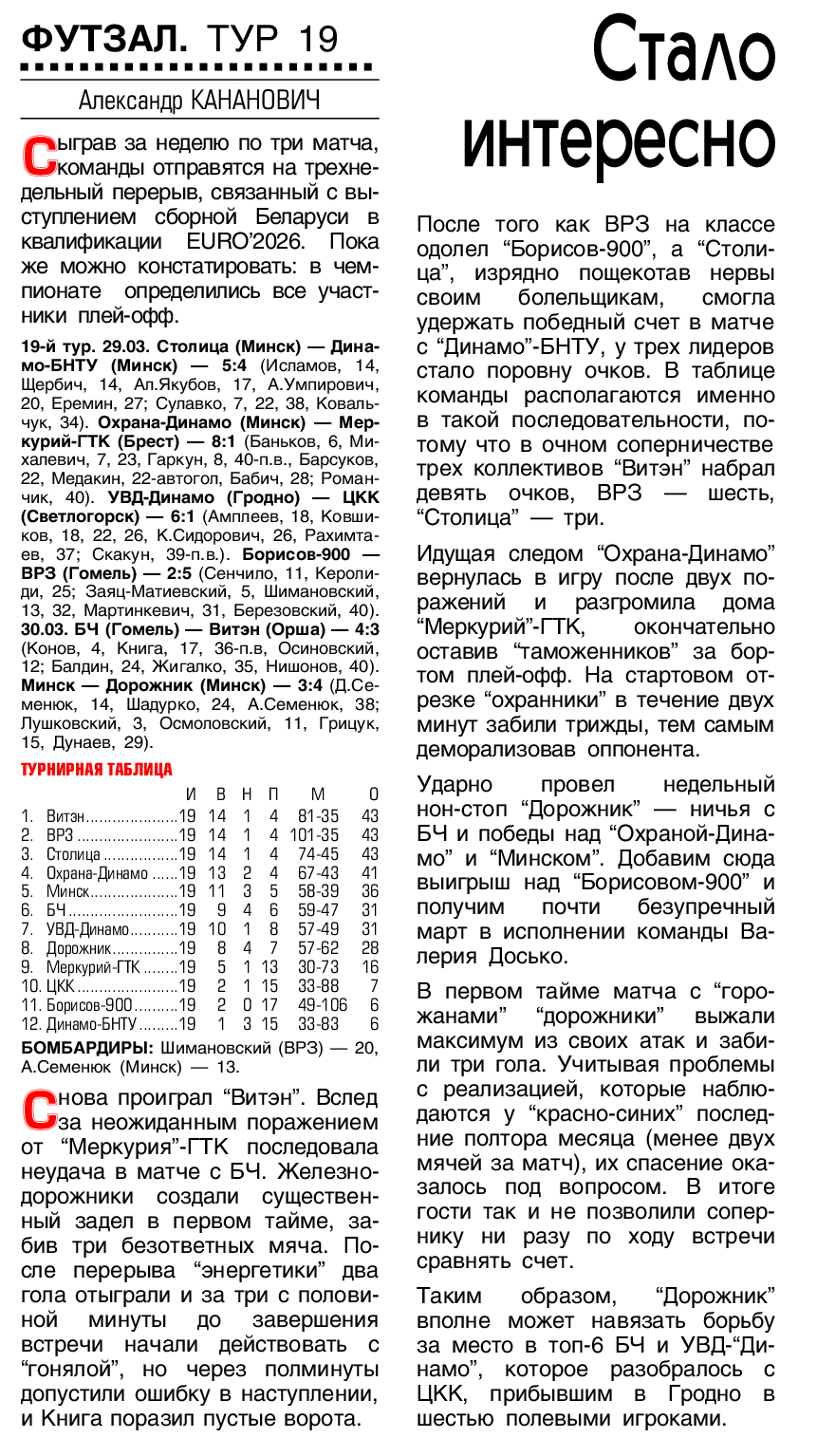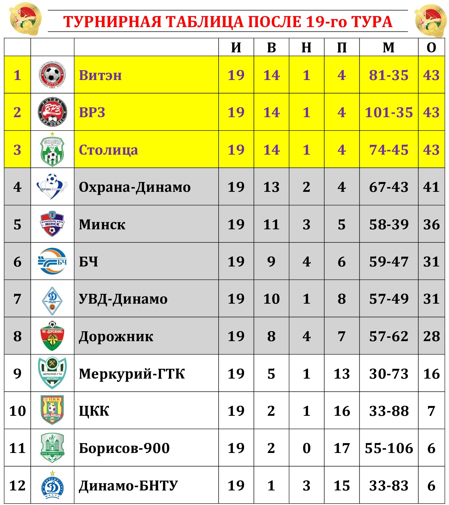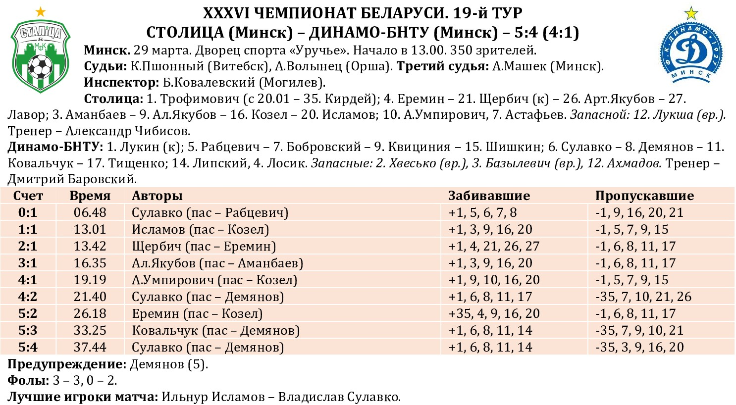 Продолжаем подводить статистические итоги прошедших туров чемпионата страны. На сайте МФК «Столица» публикуем полную статистику состоявшихся матчей 19-го тура с указанием авторов голевых передач и показателей «плюс/минус», видеотрансляции, а также турнирную таблицу, символическую сборную, лучшего игрока, список лидеров среди бомбардиров, снайперов («гол + пас»), лучших по системе «плюс/минус», материалы прессы, подборку лучших голов тура, свежий выпуск «Ясно о мини-футболе». Вся информация о прошедшем туре собрана под одним заголовком в одном месте!