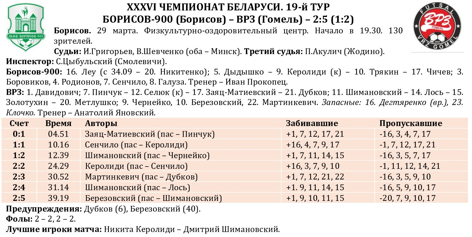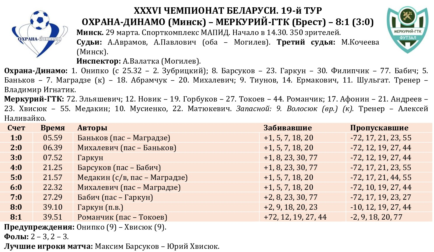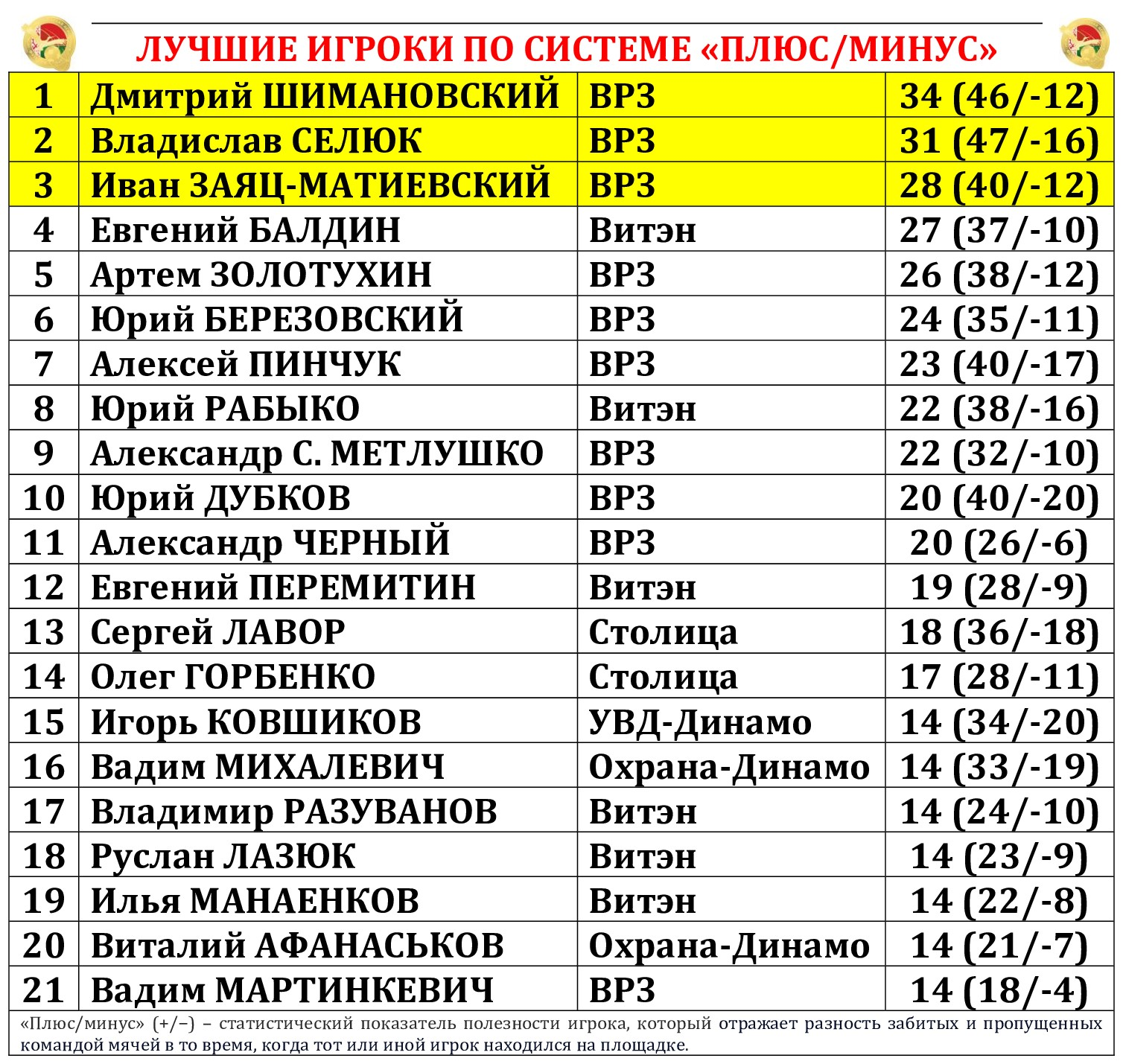Продолжаем подводить статистические итоги прошедших туров чемпионата страны. На сайте МФК «Столица» публикуем полную статистику состоявшихся матчей 19-го тура с указанием авторов голевых передач и показателей «плюс/минус», видеотрансляции, а также турнирную таблицу, символическую сборную, лучшего игрока, список лидеров среди бомбардиров, снайперов («гол + пас»), лучших по системе «плюс/минус», материалы прессы, подборку лучших голов тура, свежий выпуск «Ясно о мини-футболе». Вся информация о прошедшем туре собрана под одним заголовком в одном месте!