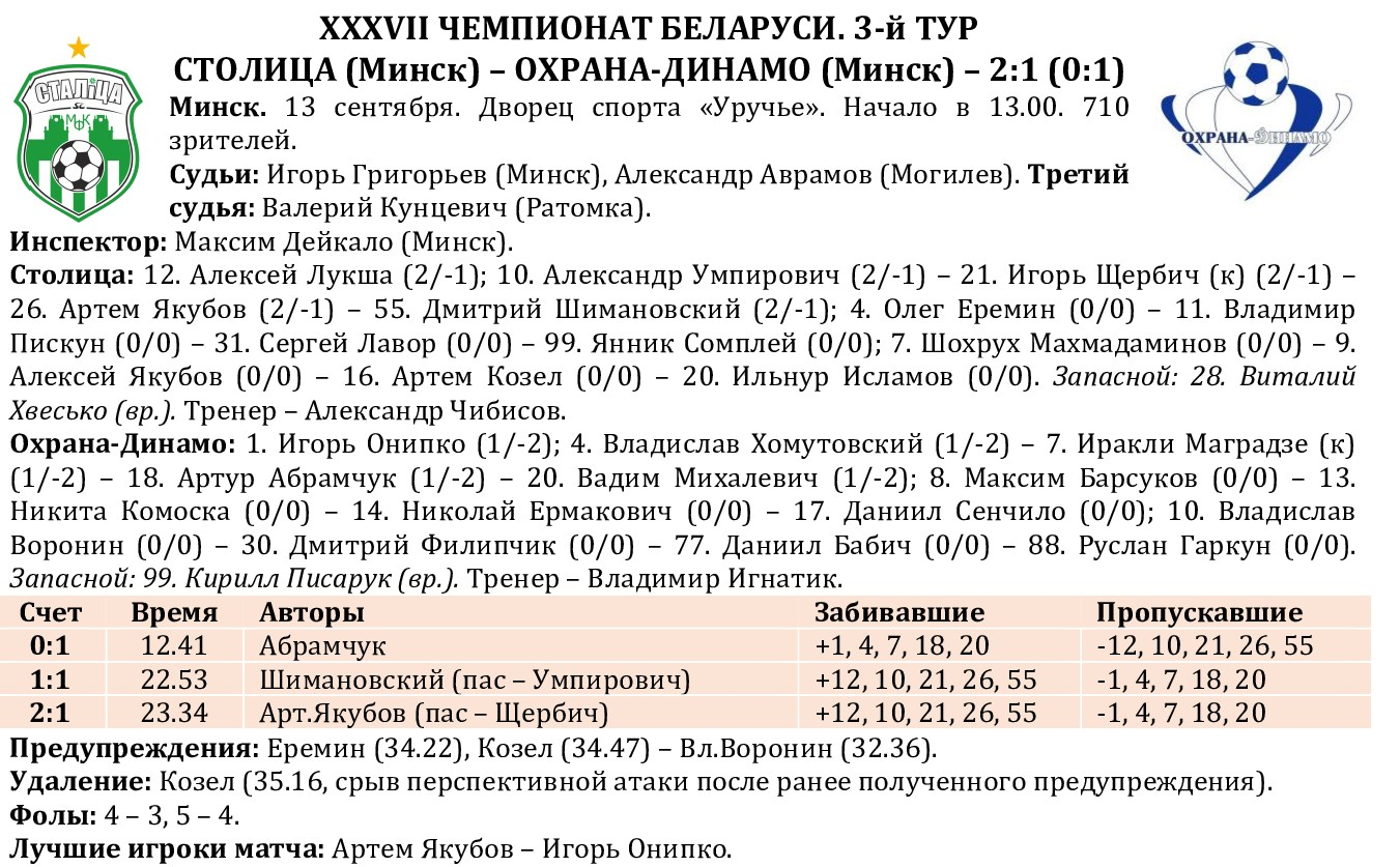 «Охрана-Динамо» приехала в субботу в армейский Дворец спорта в роли лидера, одержав на старте две виктории. Однако осечка в матче со «столичниками» сразу отбросила дружину Владимира Игнатика на шестую позицию. До матча под сводами арены подняли майку Олега Горбенко, который завершил игровую карьеру, но продолжит работу в структуре клуба в качестве тренера детской Академии. Его рекорды по количеству сыгранных за «Столицу» матчей и забитых мячей побить следующему поколению будет невероятно сложно! Отметим, что «Столица» одержала над «охранниками» в чемпионате 21-ю победу подряд, не проигрывая им с декабря 2013 года! Однако далась она на сей раз ох как непросто. При ощутимом территориальном и игровом перевесе подопечные Александра Чибисова умудрились проиграть первый тайм, «привезя» гол сами себе. Игоря Щербича «обокрал» Артур Абрамчук и открыл счет в матче. Восстановить статус-кво хозяева сумели только после перерыва, когда за 41 секунду перевернули положение дел на площадке. Сначала продолжающий штамповать голы и в новом клубе Шимановский воспользовался передачей Умпировича, а затем реабилитировался наш капитан, пяткой отдав такой пас Якубову-старшему, что забить было проще, чем промазать. Шанс спастись гости получили в концовке, когда за фол против Абрамчука второй «горчичник» получил Артем Козел. Но «Столица» в меньшинстве выстояла и довела встречу до логического завершения – второй победы в чемпионате. В воскресенье в Малориту в расположение сборной отправились Алексей Лукша, Игорь Щербич, Артем Якубов, Дмитрий Шимановский и массажист Владимир Белкин. Национальной команде 20 и 22 сентября предстоят спарринги со сборной Сербии, вот только как туда добраться? Поляки границу в районе Бреста закрыли, нужно искать другие варианты. А в чемпионате следующий матч «Столица» проведет в воскресенье, 28 сентября, и снова с лидером – «Дорожником», три матча подряд побеждающим.