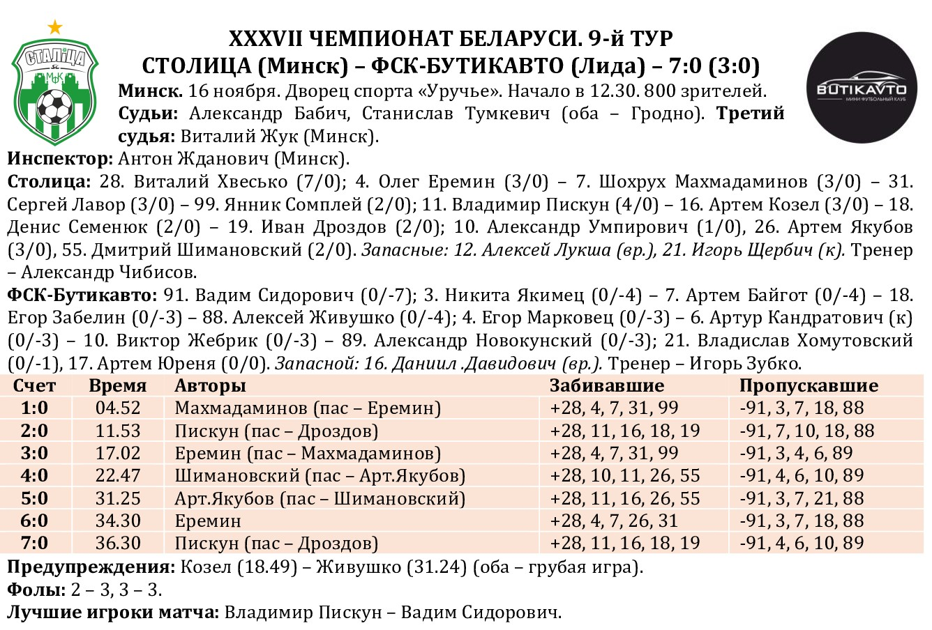 Результаты остальных матчей 9-го тура: 15.11. Охрана-Динамо – Витэн – 4:4 (3:1) (Бабич, 4, Гаркун, 10, Маградзе, 13, Абрамчук, 24; Лазюк, 5, Разуванов, 25, 37, 39). Борисов-900 – Минск – 1:6 (0:2) (Баркун, 33; Зуенок, 4, 26, 36, А.Семенюк, 5, 31, Кашевский, 31). УВД-Динамо – Меркурий-ГТК – 0:2 (0:0) (Амплеев, 26, Остертах, 38). БЧ – ВРЗ – 4:3 (3:0) (Соловьев, 10, Мокин, 13, Осиновский, 17, Новский, 35; Свириденко, 30, Пинчук, 35, Селюк, 38). 16.11. Дорожник – Динамо-БНТУ – 4:3 (3:0) (С.Новик, 2, 13, Скварчевский, 3, Свиридович, 32; Астафьев, 22-с/в, Демянов, 38, Тищенко, 40).