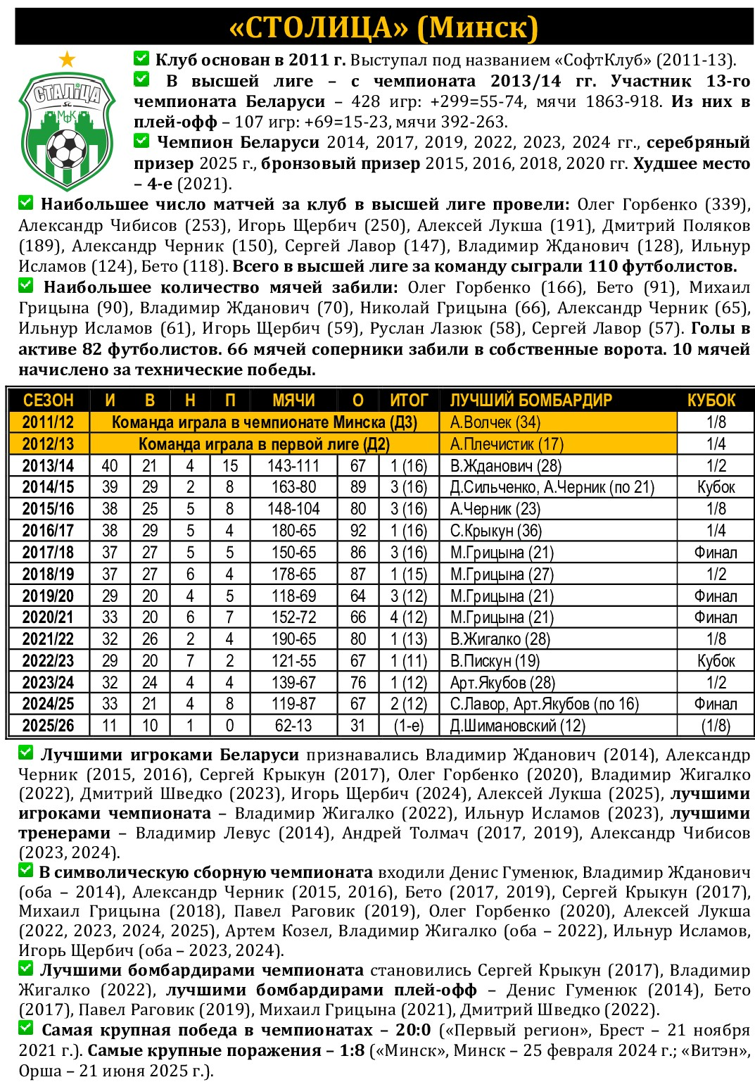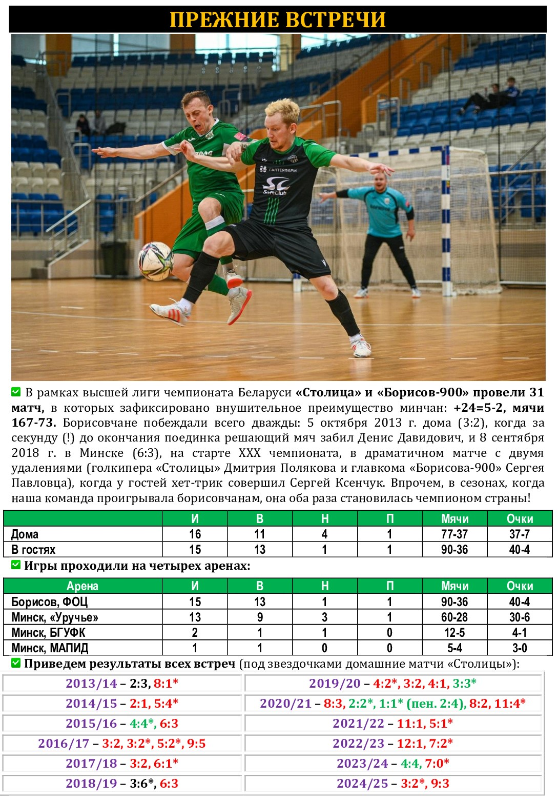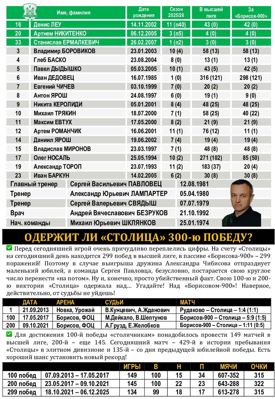 Сразу пять футболистов «Столицы» – Алексей Лукша, Александр Умпирович, Дмитрий Шимановский, Игорь Щербич и Артем Якубов – получили вызов в национальную сборную Беларуси, которая после краткосрочного учебно-тренировочного сбора отправится в Словакию, где 17 и 19 декабря проведет два контрольных спарринга с местной дружиной. По традиции дружина Александра Черника перед выездом за границу будет готовиться в гостеприимной Малорите. На Брестчину сборники выдвинутся в пятницу, на следующий день после матчей 13-го тура чемпионата страны. Он венчает соревновательную программу первого круга, и в турнире наступит пауза более чем на два месяца – борьба за титул возобновится только 14 февраля. А в паузе будет определен квартет участников «Финала четырех» Кубка Беларуси (даты его проведения под вопросом, скорее всего – в период с 7 по 11 февраля), а наша главная команда спустя 16 лет примет участие в Словении в финальном турнире чемпионата Европы. Но всё это будет скоро, а вот в четверг, 11 декабря, приглашаем всех болельщиков «Столицы» стать очевидцами и участниками матча с «Борисовом-900». В этом матче в случае нашей победы может произойти несколько важных событий. Во-первых, лидирующая «Столица» имеет прекрасный шанс прийти на промежуточный финиш первой, что в ее истории случалось прежде всего дважды: в сезонах-2017/18 и -2023/24. А вот итоговых побед, напомним, было куда больше – шесть. Причем первая позиция по итогам круга может сохраниться даже в случае ничейного результата, поскольку разность забитых и пропущенных мячей у «Столицы» куда лучше (+49), чем у идущего вторым «Витэна» (+33). Впрочем, о потере очков мы даже не думаем (в 18 матчах подряд борисовчанам в игровое время не проигрываем), поскольку, и это – во-вторых, дружина Александра Чибисова может одержать в четверг 300-ю (!) победу в высшей лиге. А «Борисов-900» (вот как совпали цифры!) может потерпеть в элитном дивизионе 300-е поражение! Отметим, что свои 100-ю и 200-ю виктории «Столица» одержала именно над клубом из Борисова. История движется по спирали! Ждем всех во Дворце спорта «Уручье»! Важны – кожны!