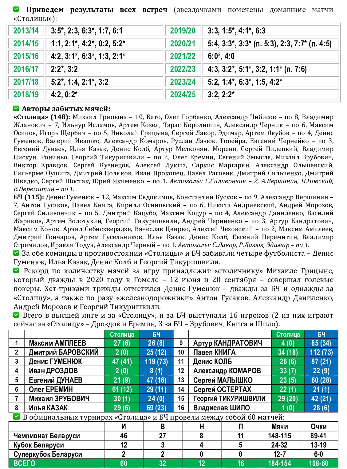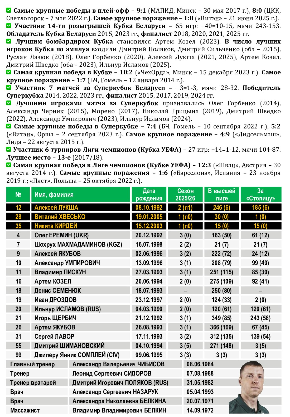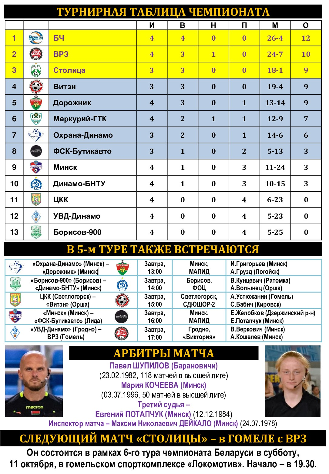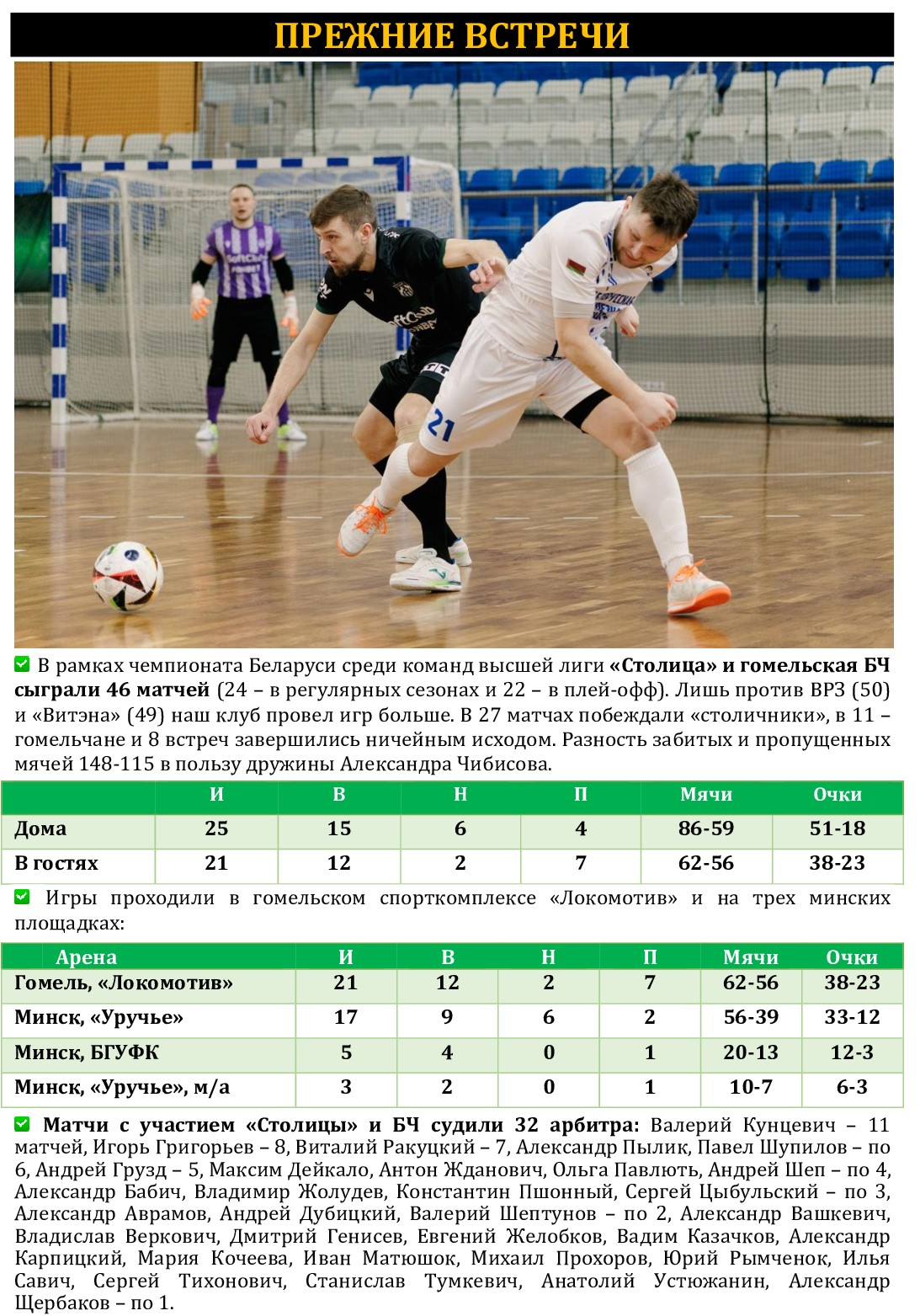 И снова, третий тур кряду, «Столица» будет экзаменовать лидирующую на момент встречу команду. «Охрана-Динамо» и «Дорожник» благополучно пройдены, соперники откатились за пределы ведущей тройки. Настал черед гомельской БЧ. Команда Александра Савинцева (тренера не чужого для «Столицы», поработавшего главным в основе и спортивным директором в Академии) в межсезонье прилично усилилась. Из российской суперлиги пришли 34-летний Дмитрий Соловьев (из питерского «Кристалла») и 21-летний Дмитрий Шишов (из новосибирского «Сибиряка»), из стана земляков из ВРЗ – забивные Евгений Клочко и Иван Заяц-Матиевский, из «Охраны-Динамо» – быстроногий Виталий Афанаськов. Четыре виктории на старте, нескрываемые амбиции на призовую тройку и первое серьезное испытание. У БЧ всего два точных удара до 2000-го гола в высшей лиге, однако, хочется верить, юбилей будет отложен до лучших времен! Наши ребята ведь тоже не лыком шиты! В прекрасном настроении вернулся с родины Шохрух Махмадаминов: его сборная Кыргызстана завоевала путевку в финальный турнир Кубка Азии. Нет дисквалифицированных, все живы-здоровы, рвутся в бой, так что тренерам придется поломать голову над определением состава. Итак, пятница, 3 октября, минский Дворец спорта «Уручье». Начало в 18.30. Приглашаем всех наших болельщиков провести этот вечер с командой и поддержать ее своими эмоциями! Важны – кожны! Посмотреть матч можно будет на телеканале «Беларусь 5», который также считает встречу «столичников» и «железнодорожников» центральной в туре.