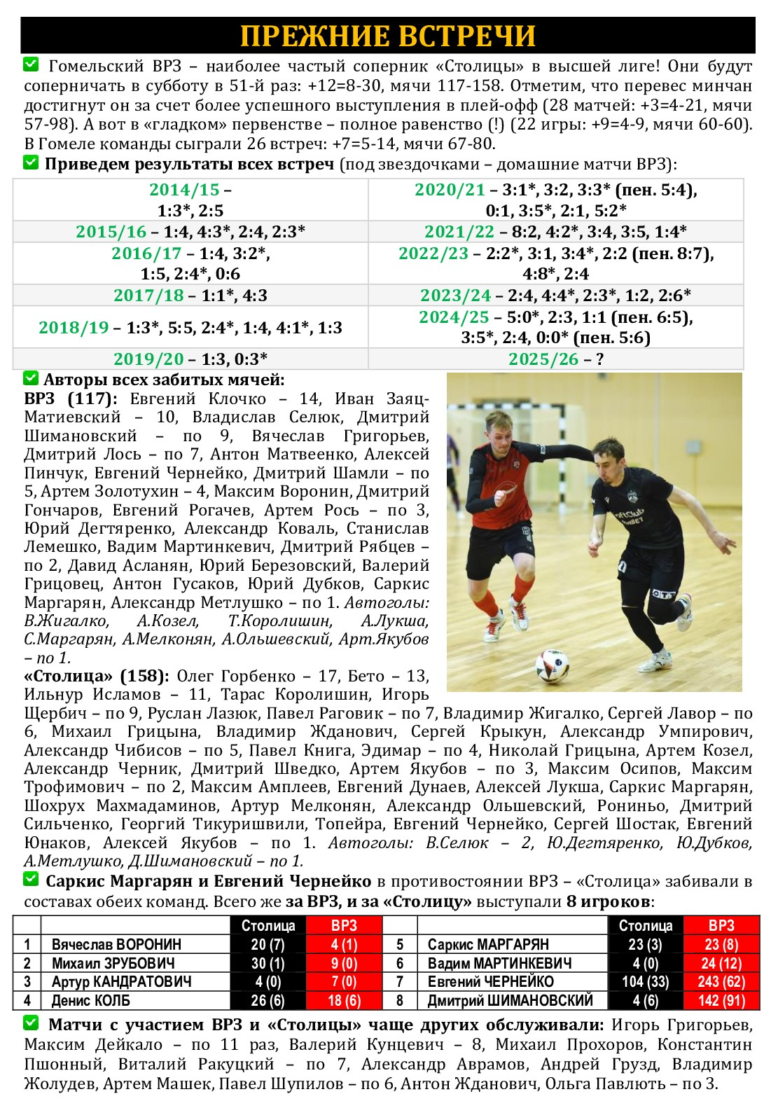 Ни с одной командой высшей лиги «Столица» в рамках чемпионата страны не играла так часто, как с гомельским ВРЗ. Команды соперничали за прошедшие 11 сезонов ровно 50 раз! И снова, уже четвертую игру кряду, «столичники» будут встречаться с командой, возглавляющей чемпионатный пелетон. Три предыдущих фаворита были обыграны, и дружина Александра Чибисова потихоньку, несмотря на пропуск одного из туров, взобралась к подступу к главному пику, который может быть покорен уже в Гомеле, в субботу, 11 октября. Матч начнется в 19.30 и в прайм-тайм будет транслироваться в прямом эфире на телеканале «Беларусь 5». Впервые ВРЗ сыграет против «Столицы» с новым тренером – Антоном Матвеенко, который не чужой для нашего клуба человек. После первого победного сезона, летом 2014 года, он проходил в составе нашей команды предсезонку, был в заявке на матч Суперкубка против БЧ, но на площадку так и не вышел, получив, тем не менее, медаль победителя, затем расстался со «Столицей» и вернулся на родину в Гомель, где до перехода в ВРЗ один сезон отыграл за ДСМТ СМП-354. И вот теперь Антон Викторович в должности главкома сменил неизменно возглавлявшего ВРЗ Анатолия Яновского. После пяти туров – ВРЗ занимает первую позицию в чемпионате, «Столица» идет второй, потому матч в Гомеле, безусловно, станет «гвоздевым». Без поддержки на берегах Сожа наша команда не останется, болельщики уже пакуют в сумки на поездку флаги, майки и шарфы. Наш сектор в спорткомплексе «Локомотив» – по традиции крайний справа. До встречи в Гомеле и у экранов телевизоров! Важны – кожны!