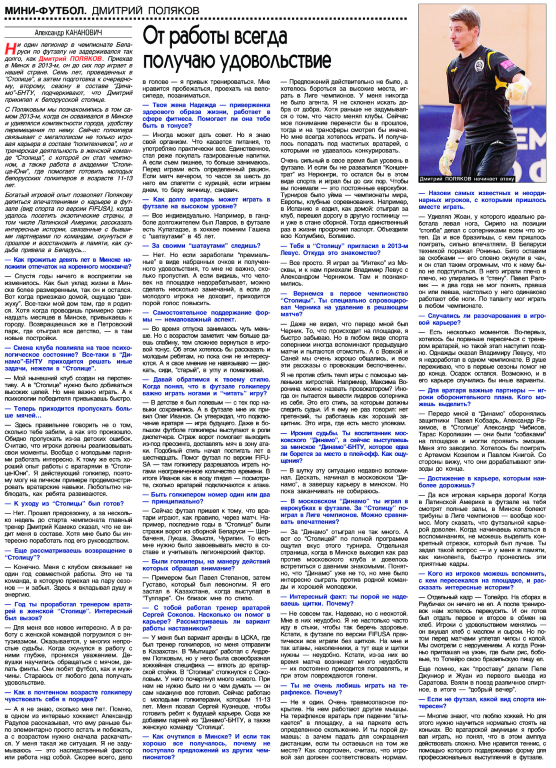 Интервью самого титулованного вратаря-легионера в белорусском мини-футболе - трекратного чемпиона Беларуси в составе «Столицы» - Дмитрия Полякова в пятничном номере газеты «Прессбол».