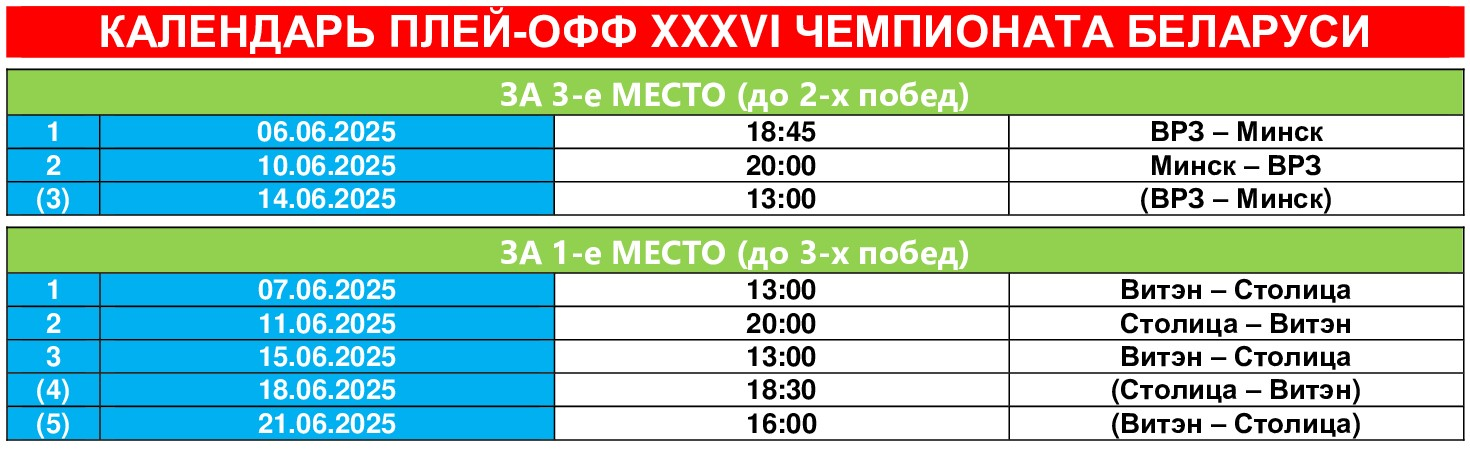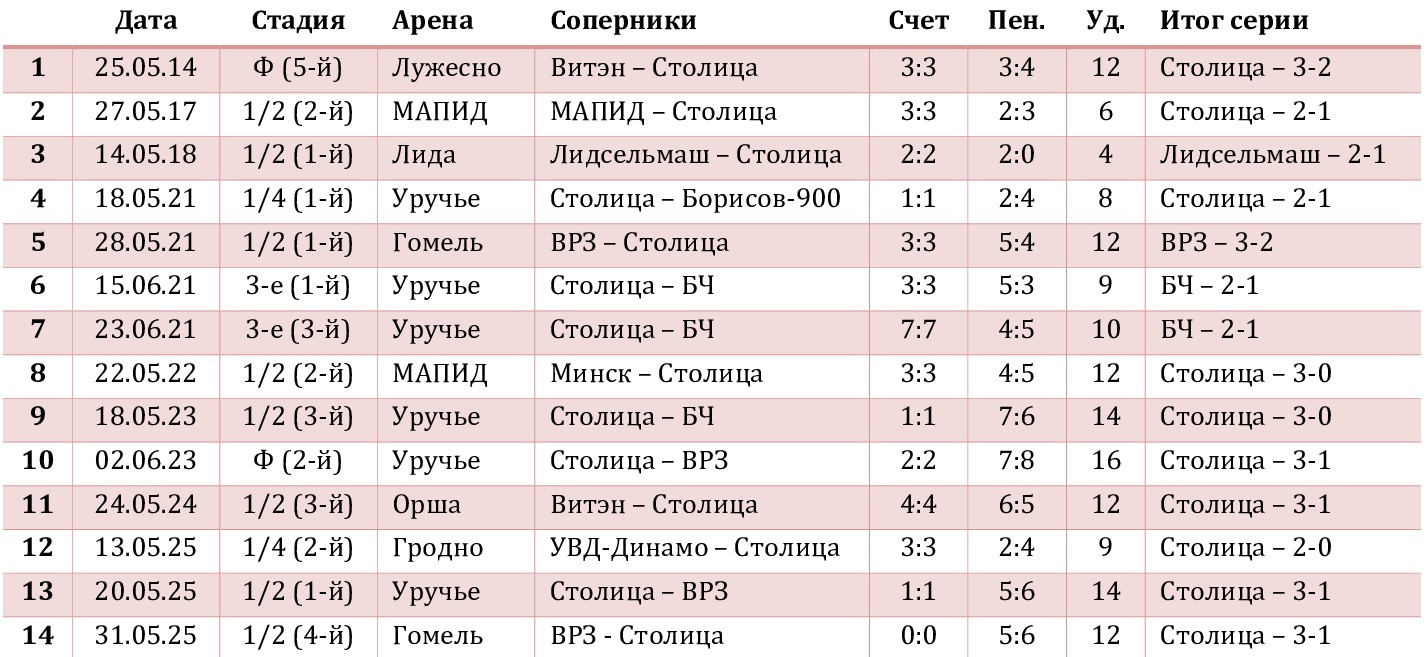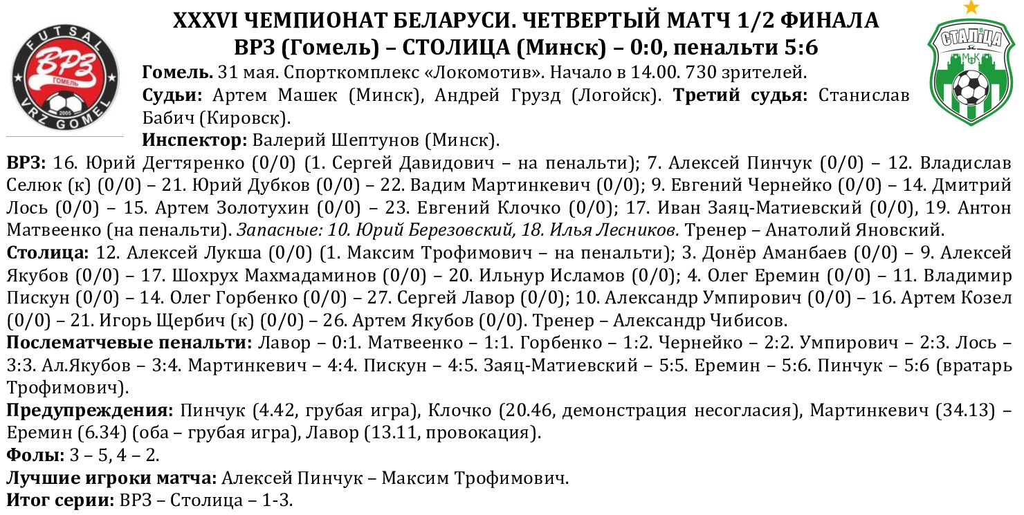 После трех неудачных попыток обыграть ВРЗ в серии послематчевых пенальти «столичники» наконец-то «сломали» эту традицию, победили и в 7-й раз в своей биографии завоевали право сыграть в финальной серии чемпионата! Напомним, что шесть предыдущих попаданий в решающую стадию неизменно заканчивались завоеванием золотых медалей! Соперничать «Столица» будет с оршанским «Витэном», который имеет 5 чемпионских титулов и в 5-й раз сыграет в финале плей-офф (2 победы и 2 поражения). Серия будет проходить до трех побед одной из команд и начнется в субботу, 7 июня, в Орше. К сожалению, в первом поединке не сможет помочь нашему клубу Сергей Лавор, получивший в Гомеле третий «горчичник» и вынужденный следующий матч пропустить.